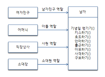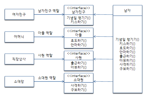 ex) 여자친구를 만날 때는 남자친구 역할만 할 수 있게 인터페이스로 제한한다.