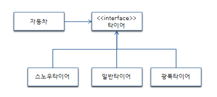 자동차가 구체적인 타이어가 아닌 추상화된 타이어 인터페이스에만 의존하게 함으로써 타이어가 변경되어도 자동차가 영향을 받지 않는다.